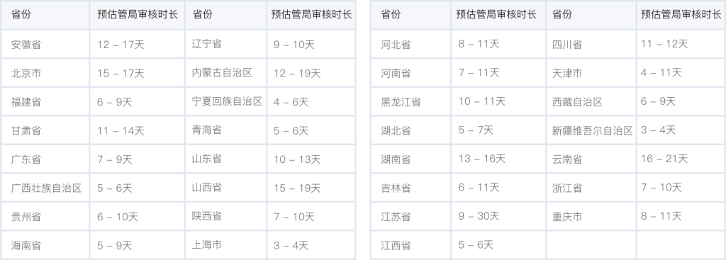 各個省管局預計審核時長,實際審核時長會根據備案場景有所不同,下表格僅供參考。詳情可查看 詳細規(guī)則。